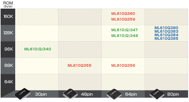 | Low power microcontrollers adding self rewriting functions and high speed clock into ML610(Q)34□ became easier to use. And wide variation of packages contributes to the satisfactory lineup. The microcontroller performance equivalent to the conventional and low power are suitable for battery driven products. |